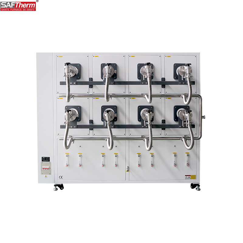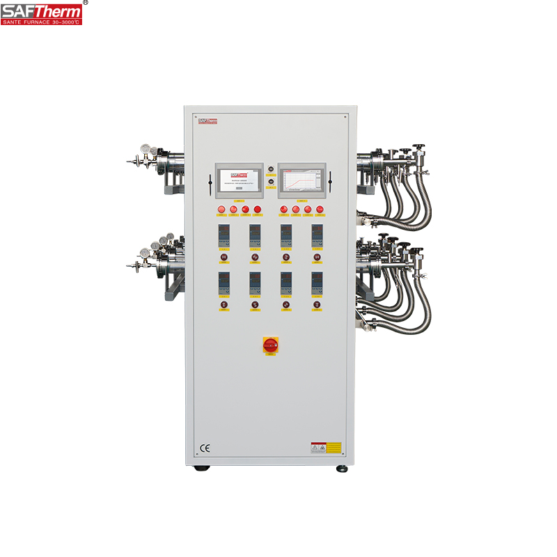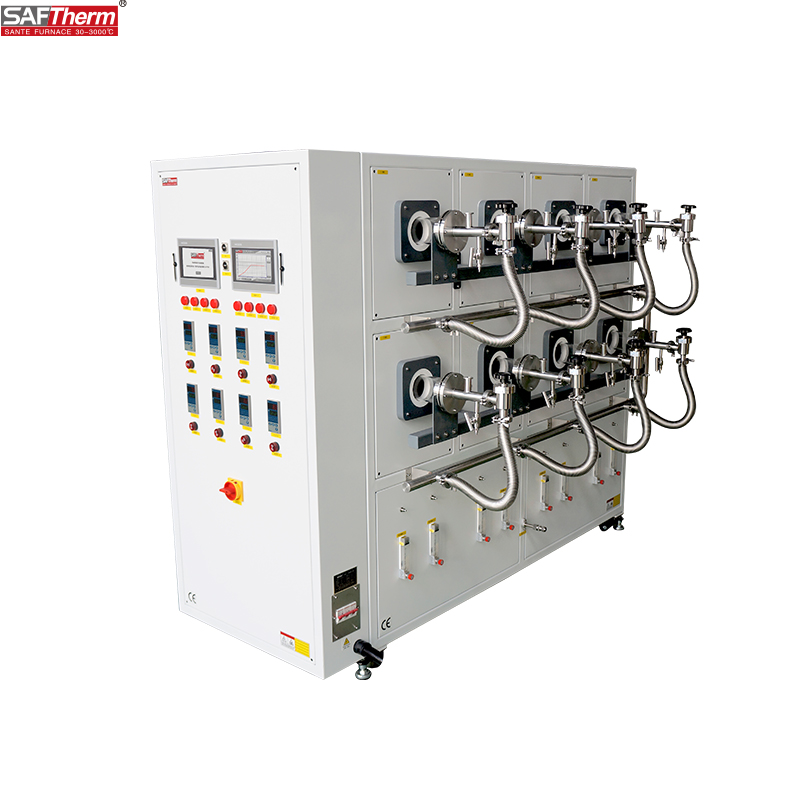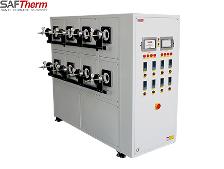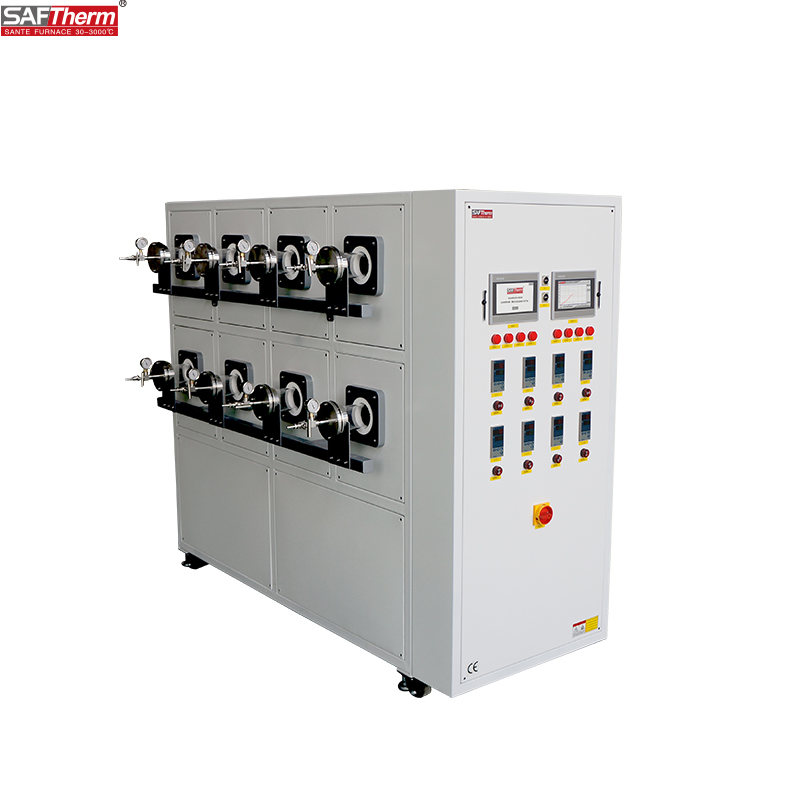 1200℃ High-Throughput Tube Furnace This product is designed for high-throughput laboratory batch sample processing. Its eight independently temperature-controlled chambers feature a new lightweight ceramic fiber lining with embedded resistance wire for rapid heating and excellent temperature uniformity. and excellent temperature uniformity. It incorporates an integrated intelligent PID temperature controller with human-machine interface, supporting 15 sets of 30-segment programmable sequences for automatic heating and holding. Featuring high-quality quartz tubes with stainless steel sealing flanges, the furnace allows for pre-vacuuming of the tube or introduction of flowing protective atmospheres, enabling batch thermal processing of samples under vacuum or controlled atmospheres.
